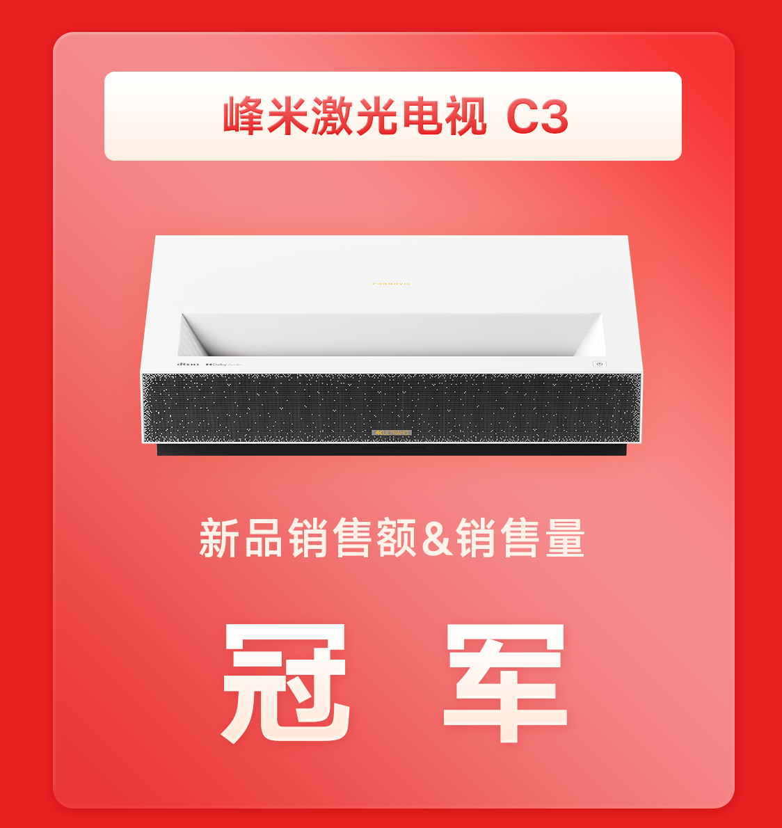 在618购物节上,刚刚发布不久的峰米激光电视C3一举成为消费者的热门之选,当选激光电视新品销售额&销售量冠军。峰米C3采用已被应用在全国28000+影院高端激光放映厅的ALPD®激光显示技术,与普通的激光技术相比,ALPD®激光显示技术更加成熟稳定,更接近自然光谱,无散斑,而且彻底避免普通三色激光由于激光的相干性先天会存在的散斑问题,这让峰米C3在至关重要的亮度性能上提升至400nit,较市场同价位激光电视产品提升近20%,配合4K分辨率、3000:1对比度等画面配置,让峰米C3百吋大屏下依然能呈现分毫可见的锐利清晰画面,展现鲜明亮点、炫丽色彩和深邃的暗部细节,彻底改变家庭观影体验。在硬件配置方面,峰米C3也可谓诚意满满,峰米C3搭载高端电视同款的MT9669芯片,接口上,峰米C3拥有3个HDMI2.1接口,可轻松连接电脑、游戏机、次世代主机,还有USB 2.0等接口适用于游戏等多种场景,无限拓展大屏娱乐新可能。如此优异的配置,618售价仅为11999元,自然引发消费者的购机热潮。